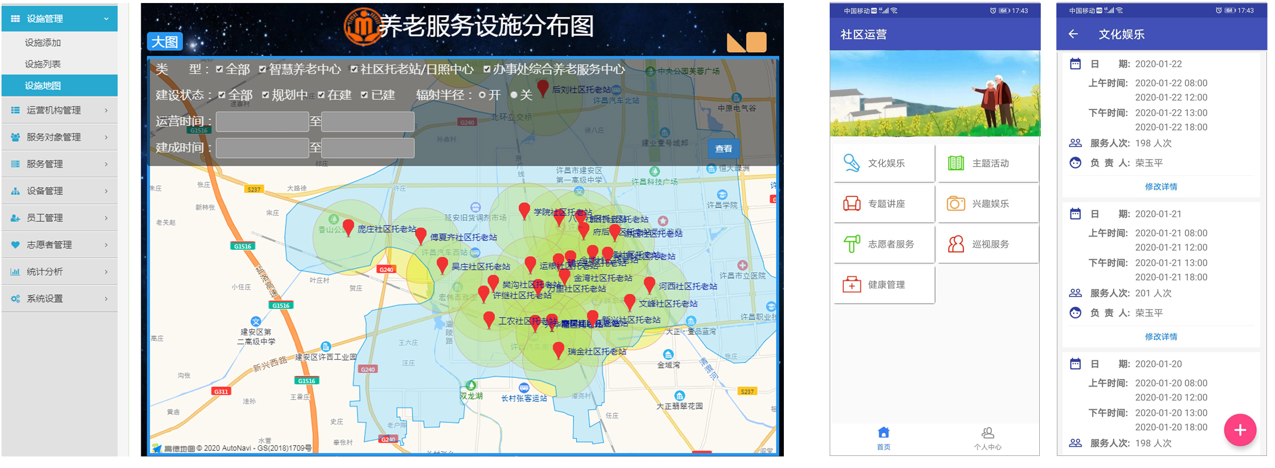 管理內容包括社區養老服務設施信息管理和日常運營管理和統計分析等方面。幫助民政老齡部門實時了解社區養老服務設施的建設情況、運營狀況,保障福利資金的合理分配和有效利用,提高科學決策水平。同時,也有利于社區養老服務機構進行精細化管理,提高設施利用率,提高服務水平和管理水平,提高服務對象的滿意度。